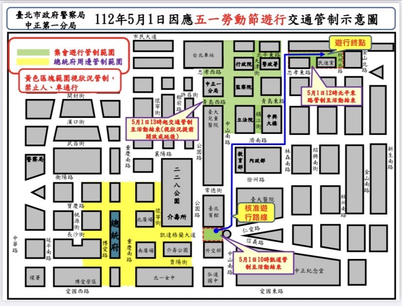 【者李叔霖/台北】工於五月一日上午十至下午四「五一行」活,地就在格大道、北平路等路。台北市警察局中正第一分局昨日表示,中午十二在道集,下午一四十分行出,定下午四活束。此外,警方提供府交管地,呼民、人、用路人提前改走其他路段。