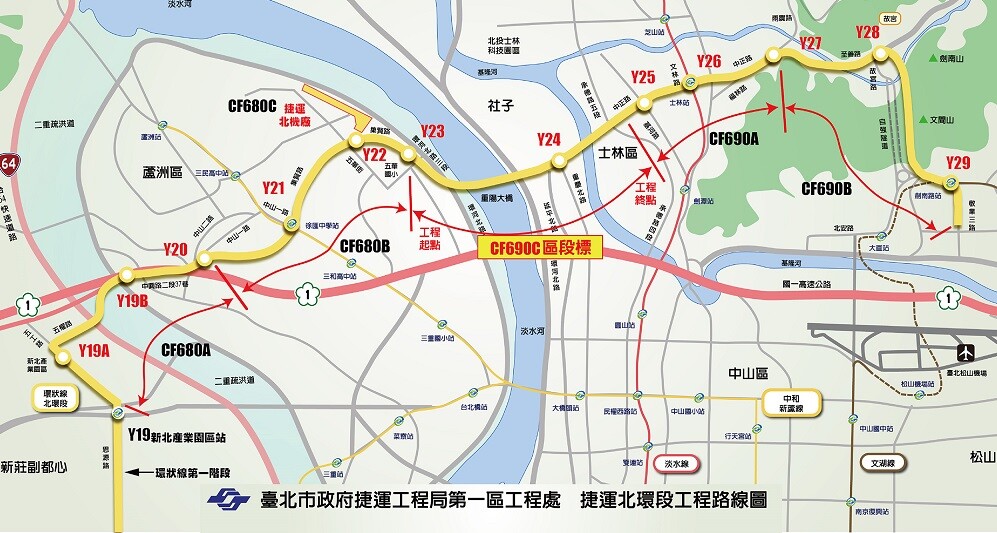 台北捷局指出,北段CF690C段工程,起自新北市三重五小,沿著重百,以盾隧道方式穿越淡水河及基隆河二重要河道下方,至台北市士林明高中附近士商路止,路度二七公里。