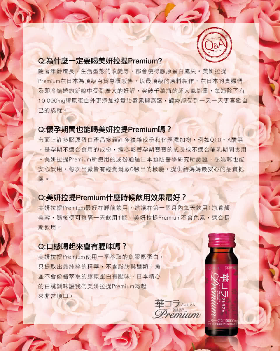 [成分] 水、原蛋白胜月太10,000毫克、赤藻糖醇(甜味)、檬酸、果酸、合香料(白桃、水蜜桃、西印度桃味)、生素C(100毫克)、胎粉末、山茶花籽萃取、苯甲酸(防腐)、牙酮糖(甜味)、子胚芽萃取、蔗糖素(甜味)、桃萃取、N-乙醯葡萄糖胺、生素B1、生素B2、生素B6、燕萃取、骨。