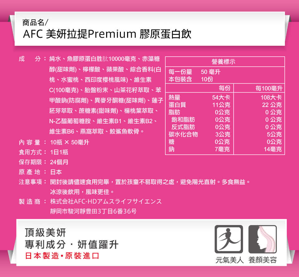 [出商品容] AFC 美妍拉提Premium原蛋白(50ml/瓶,10瓶/盒)×4,共4盒。
