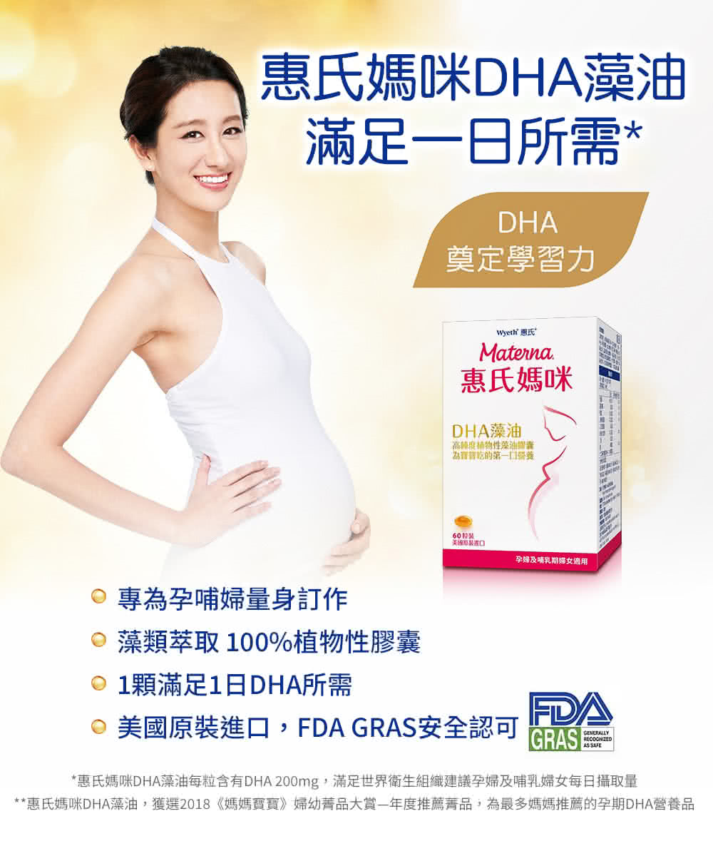 ● 惠氏咪DHA藻油每粒含有DHA 200mg,足一日所需*