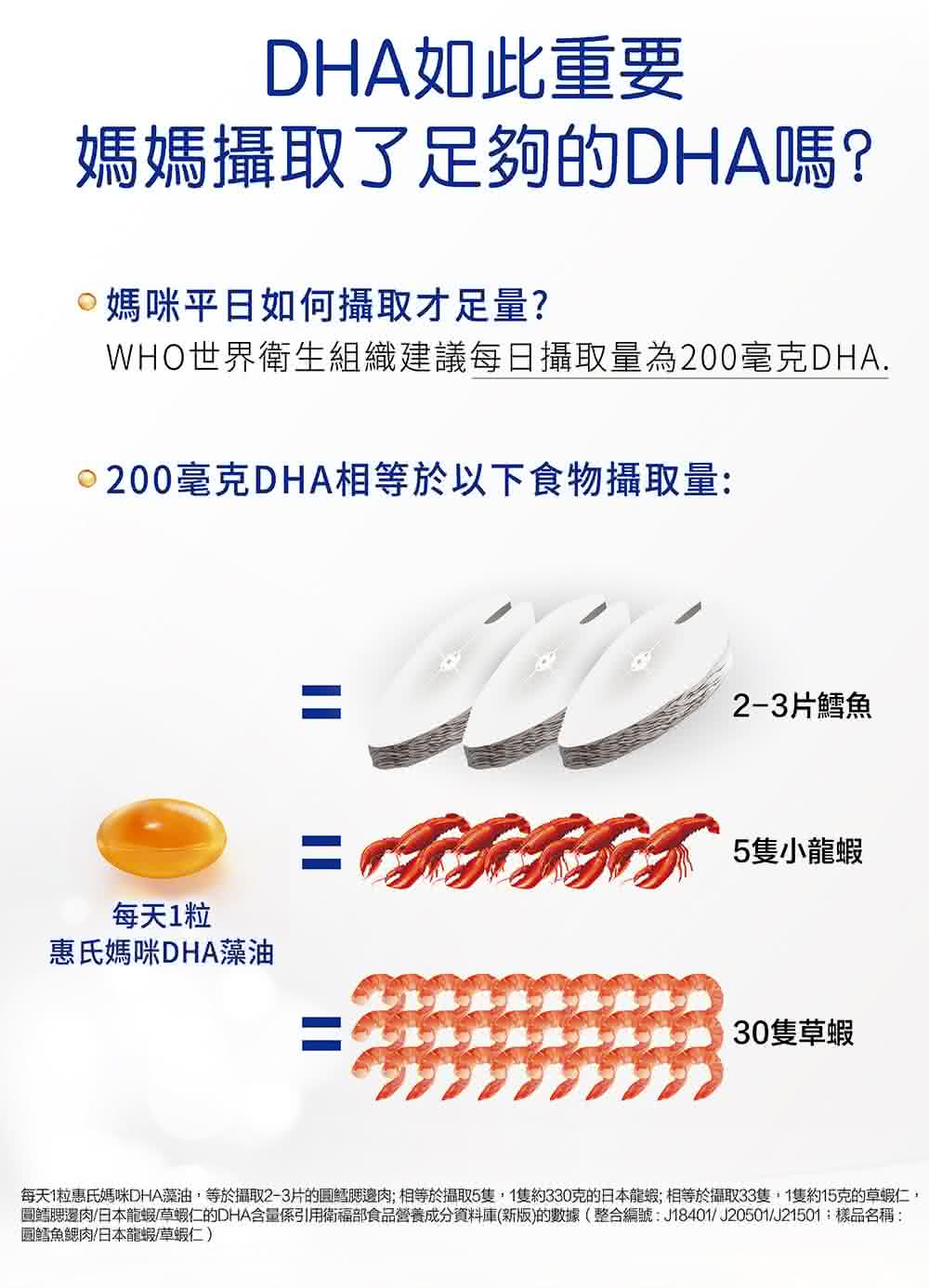 *惠氏咪DHA藻油每粒含有DHA 200mg,足世界生建孕及哺乳女每日取量