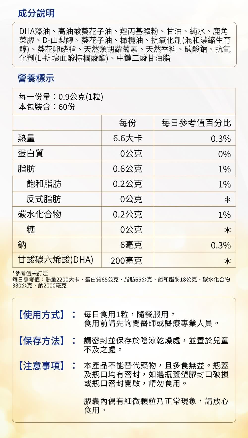4.容物名(成分):DHA藻油、高油酸葵花子油、丙基粉、甘油、水、鹿角菜、D-山梨醇、葵花子油、橄油、抗氧化(混和生育醇)、葵花卵磷脂、杜沙藻萃取物(含天然胡素)、天然香料、碳酸、抗氧化(L-抗血酸棕酸酯)、中三酸甘油酯