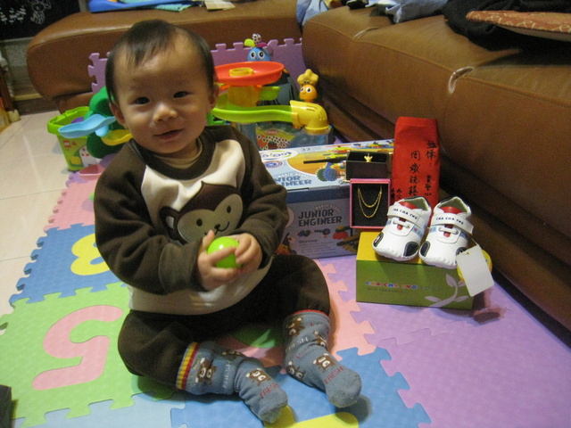 有奶奶送的智高木,有小舅舅送的老虎金、外公外婆送的金、鞋子和超大包的包(真的很大~~五位唷!跟咪一月的薪水差不多XD)
