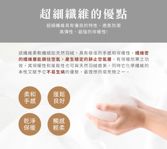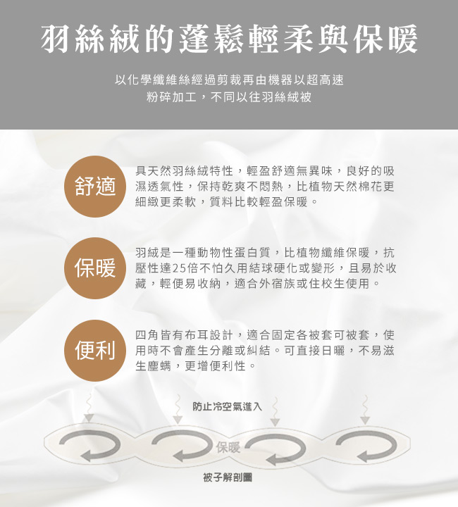 科技羽 盈保暖、台精 睡眠更安心、感柔透 高保、符合人工 更好眠、除抗菌,舒舒也!