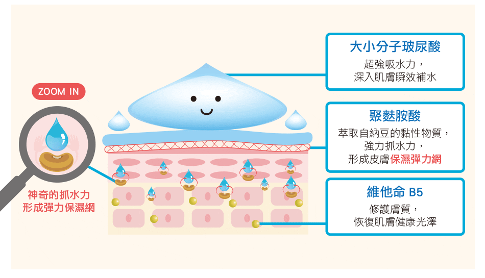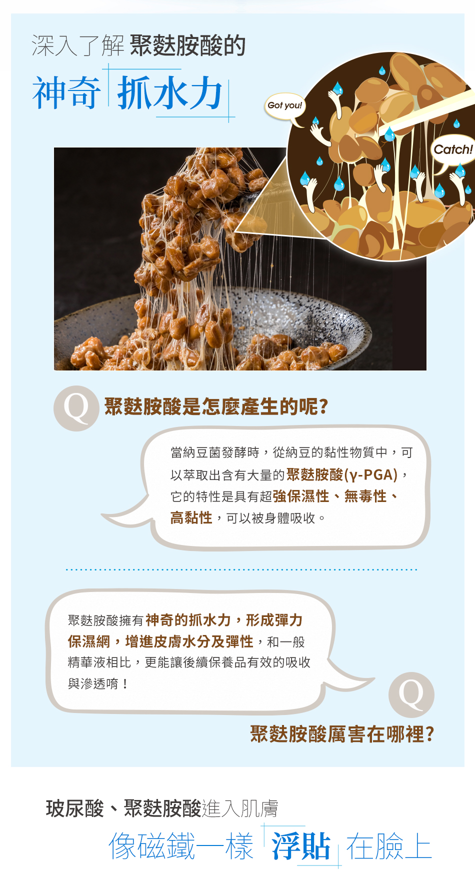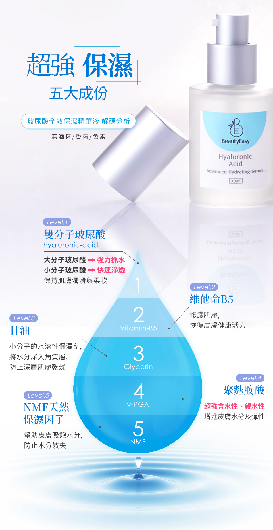 玻尿酸全效保精液除了原有的高度玻尿酸、他命B5外,特添加了聚胺酸(於豆中萃取),能抗氧化,肌建立重的防,使肌光滑,更好、更加值的保抗老效果。