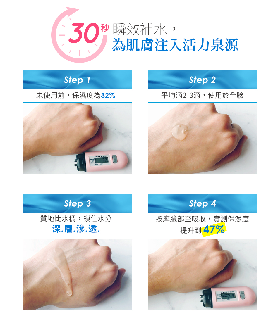 除了高度的保水配方外,更添加了能防外界害的抗老化植物萃取,需使用少量,就能到良好的保效果,不是早晚清後,或者是在冷房中,只要肌感乾燥,在肌上抹滴於乾燥部位,就能迅速止肌的渴。