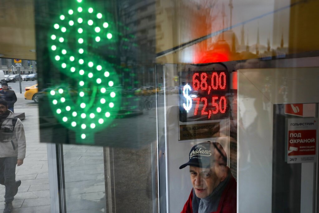 伴油暴跌,俄斯亦放任布值。短短一月的,布美元已由2月中旬64跌至3月15日的74。3月10日,莫斯科一家店展示美元及元布的率。(AP)