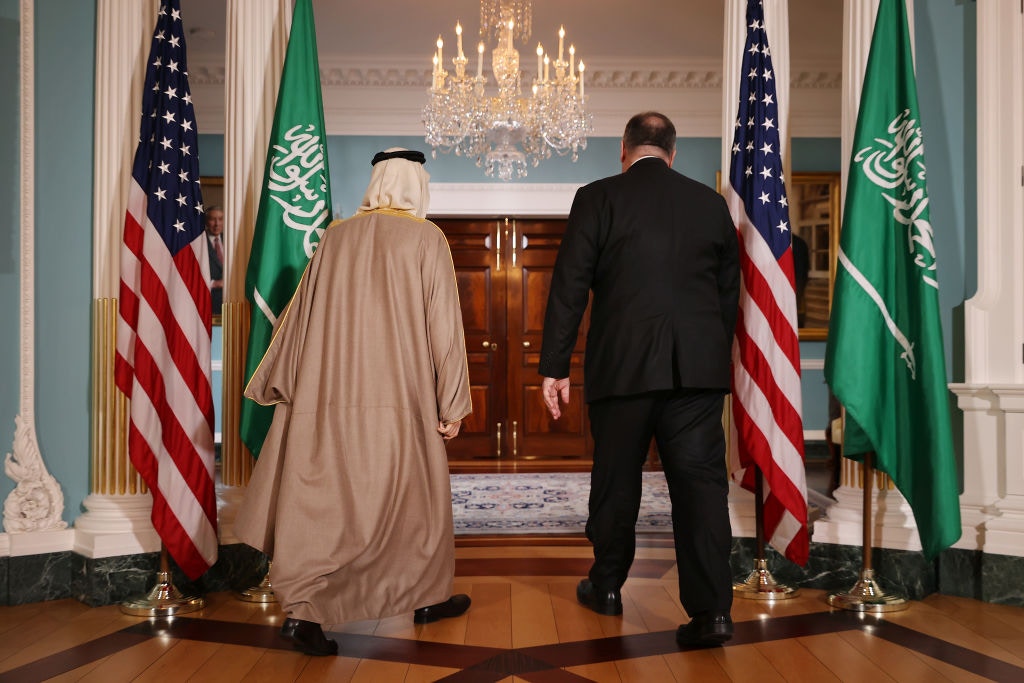 2月12日,美卿蓬佩(Mike Pompeo,左)在府沙特外朱拜(Faisal bin Farhan Al Saud )晤。日前,俄斯沙特石油企展密切晤,洽模百美元的合作目。(Getty)