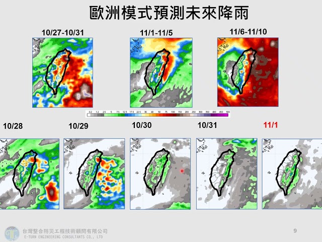 新表示,四(30日)午後各地山、高屏及宜花地仍可能出零星降雨;五(31日)北北基地及宜降雨率提升;六(11月1日)午後山有零星短雨,日(11月2日)新北山及宜花地有零星短雨,午後中南部山有零星短雨;下一(11月3日)宜花地有局部短雨,午後受面影,苗栗以北及中南部山也可能出雨;下二、三(11月4、5日)再度受北季影。