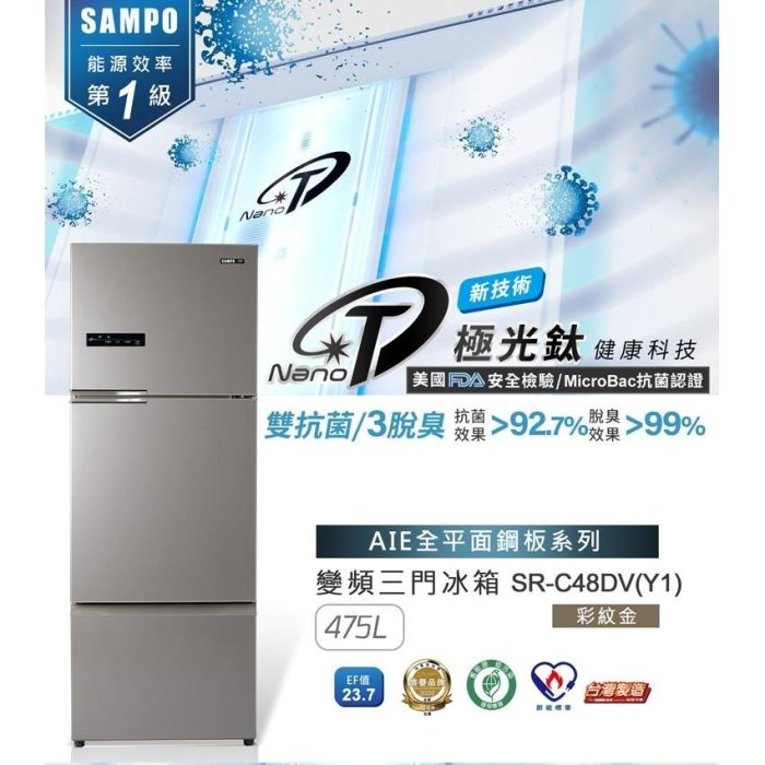 優寶購物《ubao.Tw》特貨品商城,黑貓宅配,取貨付款,聲寶SAMPO 480公升 1級 變頻 雙門冰箱 SR-C48DV AIE智慧節能 外顯式觸控面板 | Yahoo拍賣