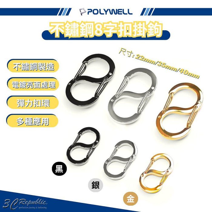 優寶購物《ubao.Tw》特貨品商城,黑貓宅配,取貨付款,POLYWELL 寶利威爾 不鏽鋼 8字 掛鉤 S扣環 快拆 彈性扣環 掛繩 背包 公事包 鑰匙圈 零錢包 吊飾 揹帶 | Yahoo拍賣