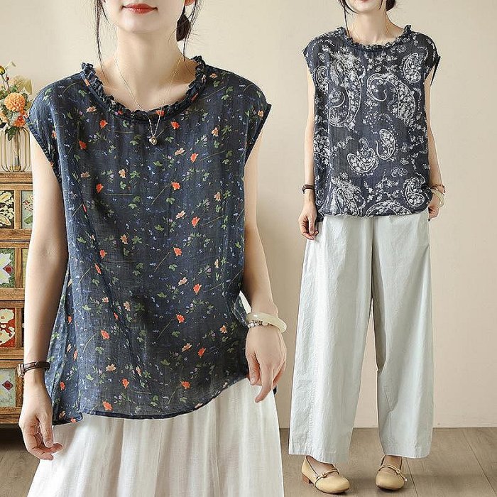 優寶購物《ubao.Tw》特貨品商城,黑貓宅配,取貨付款,背心棉麻衫 無袖T恤 無袖背心 無袖棉麻衫 無袖上衣 2025年夏季新款棉麻文藝復古印花木耳領后排扣寬松無袖上衣女3 | Yahoo拍賣