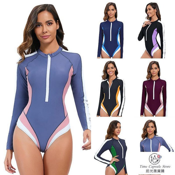 優寶購物《ubao.Tw》特貨品商城,黑貓宅配,取貨付款,新款撞色長袖防曬連體泳衣女歐美性感三角沖浪服保守泳裝 | Yahoo拍賣