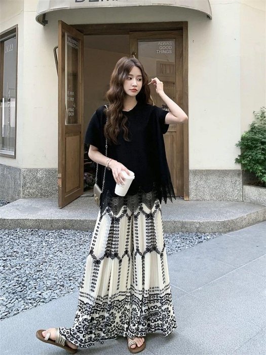 優寶購物《ubao.Tw》特貨品商城,黑貓宅配,取貨付款,鬆弛感 ~ 細摺蕾絲短袖上衣+波西米亞長褲裙 🍁 套裝 | Yahoo拍賣