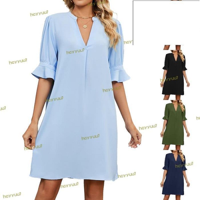 優寶購物《ubao.Tw》特貨品商城,黑貓宅配,取貨付款,【精選】2023夏季新款純色v領寬鬆縮褶五分袖連衣裙女 | Yahoo拍賣