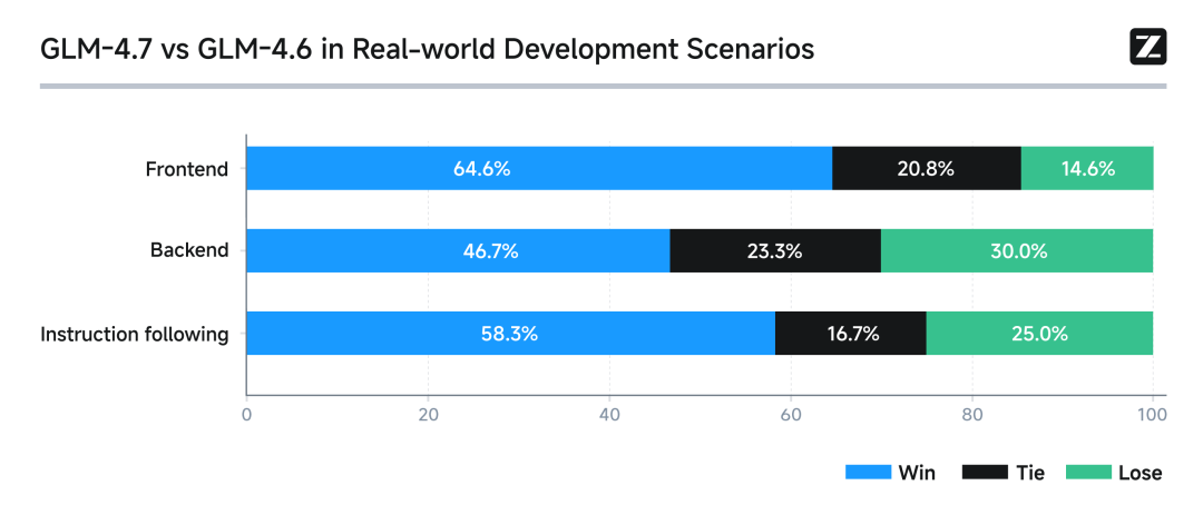 在 Claude Code 环境中,我们对 100 个真实编程任务进行了测试,覆盖前端、后端与指令遵循等核心能力。结果显示,GLM-4.7 相较 GLM-4.6 在稳定性与可交付性上均有明显提升。