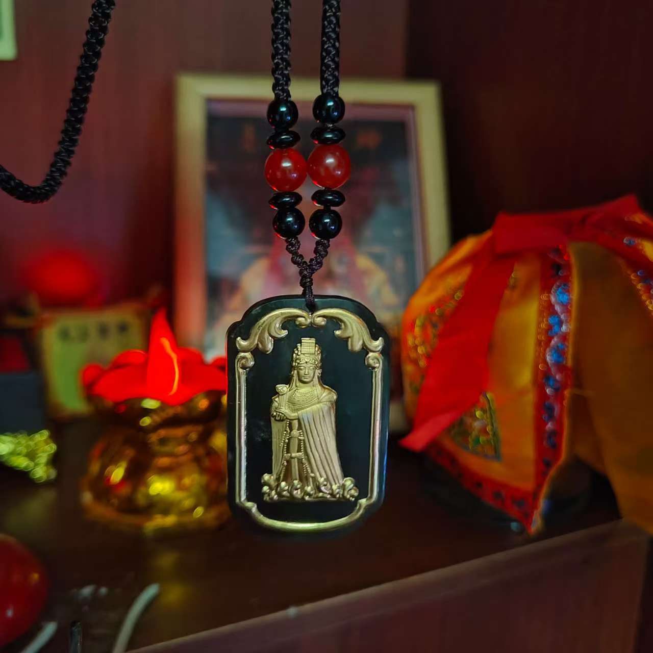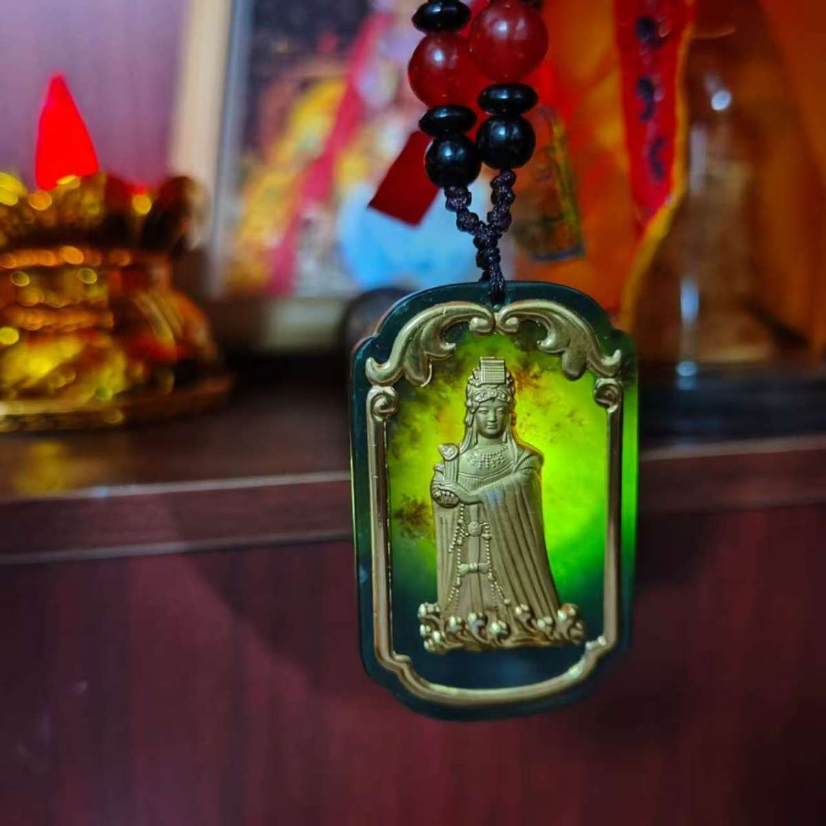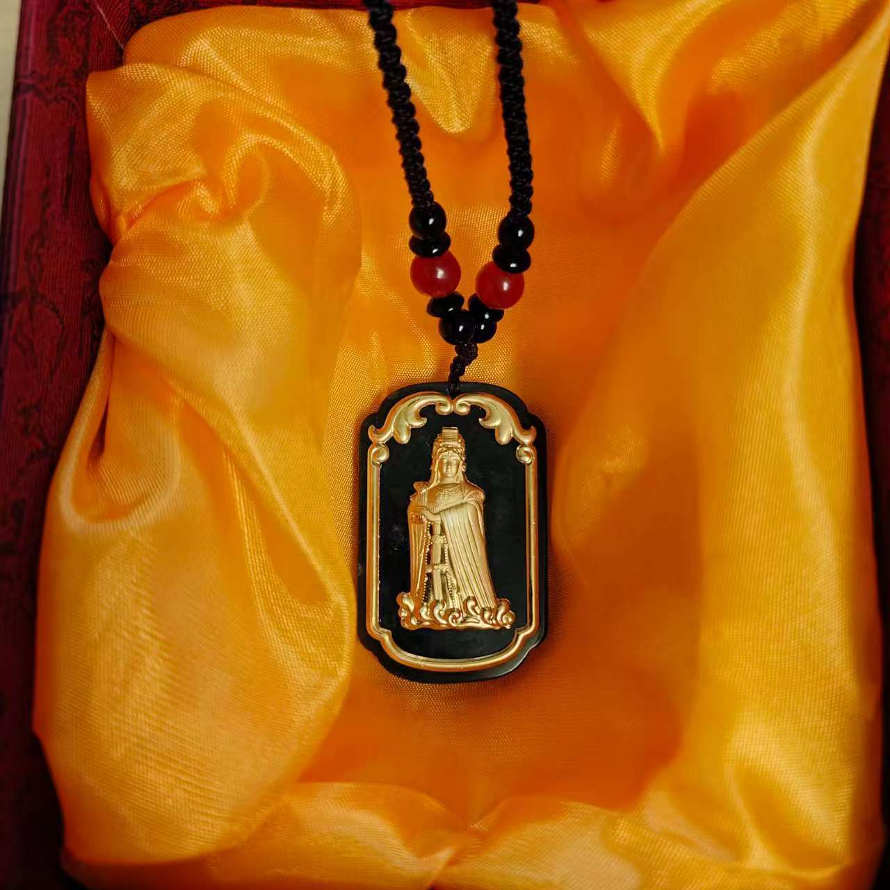湄洲海上女神媽祖和田玉吊墜金鑲玉媽祖保平安金鑲玉墨玉方牌