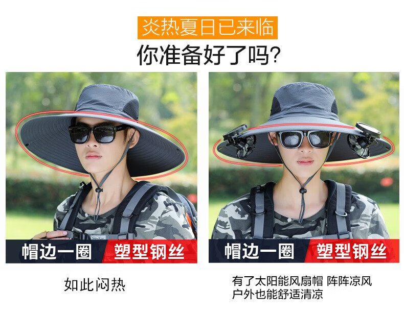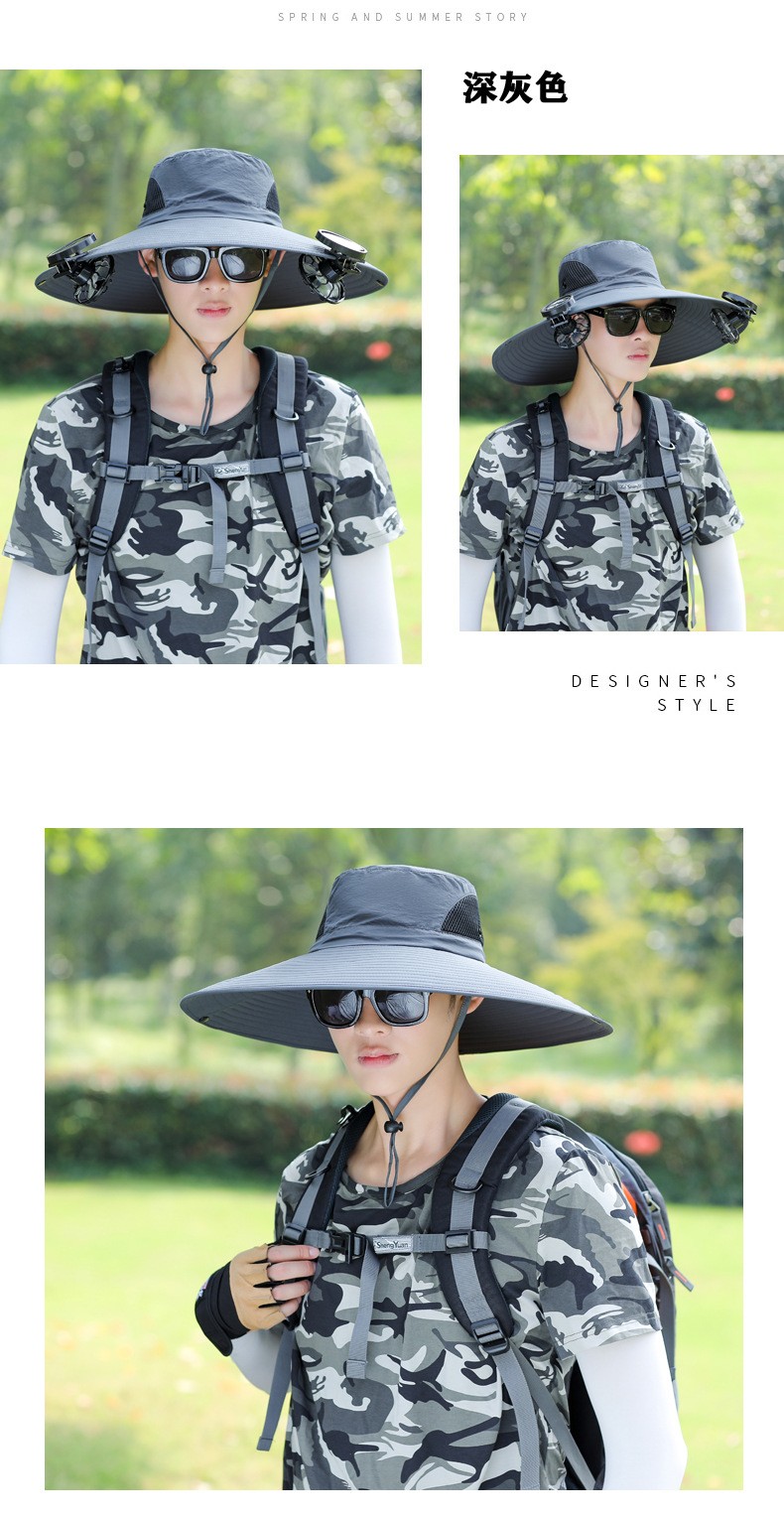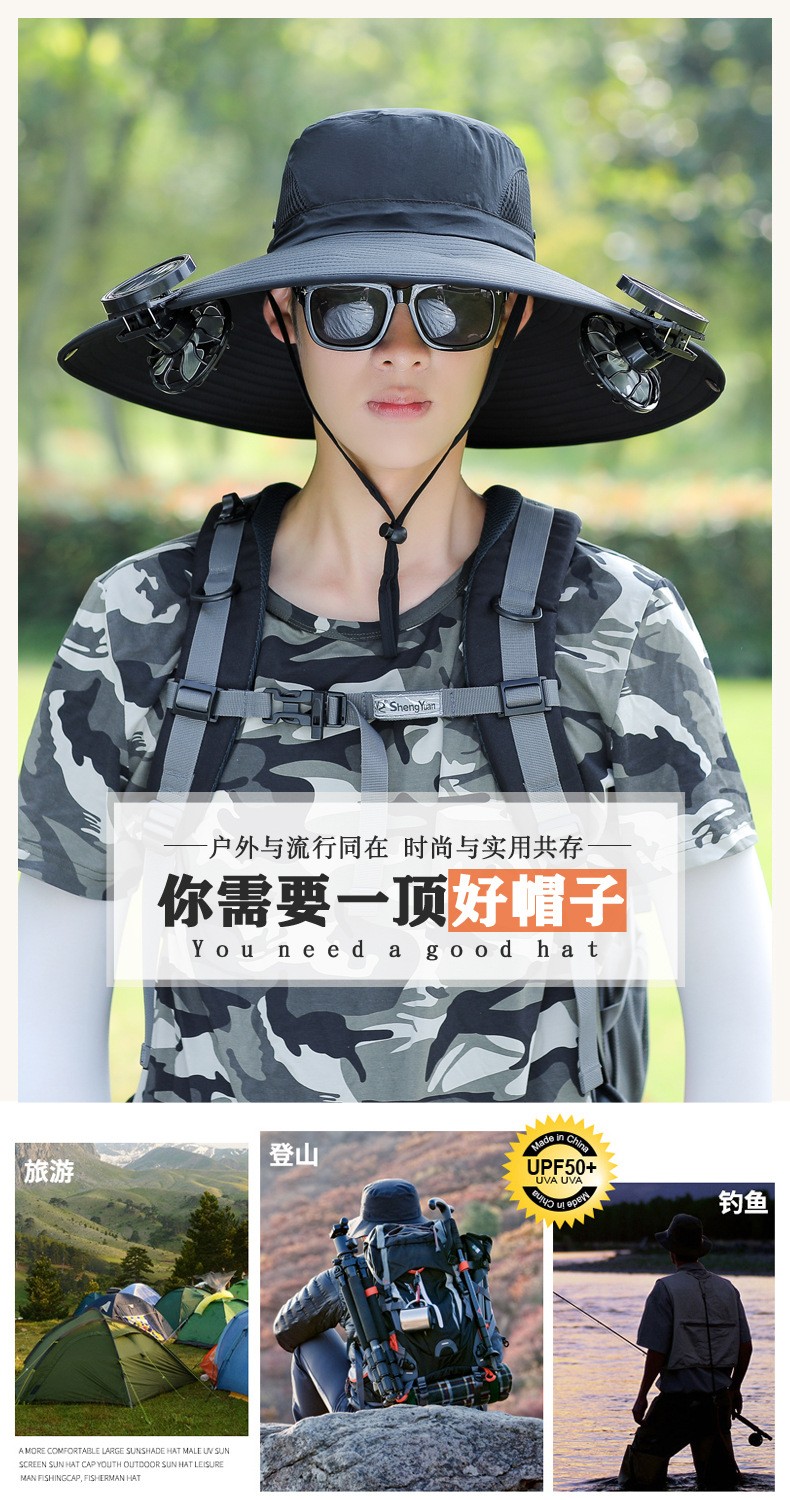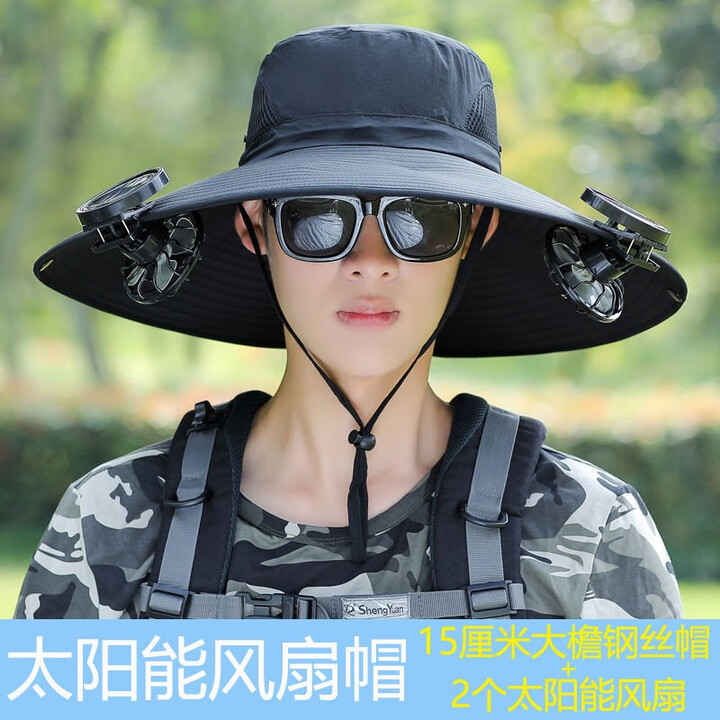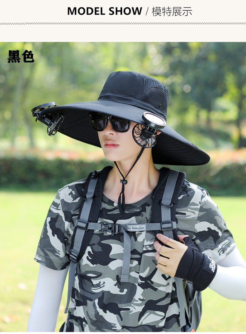 太陽能風扇帽 黑色 【鋼絲款+2個太陽能風扇】大檐透氣漁夫帽