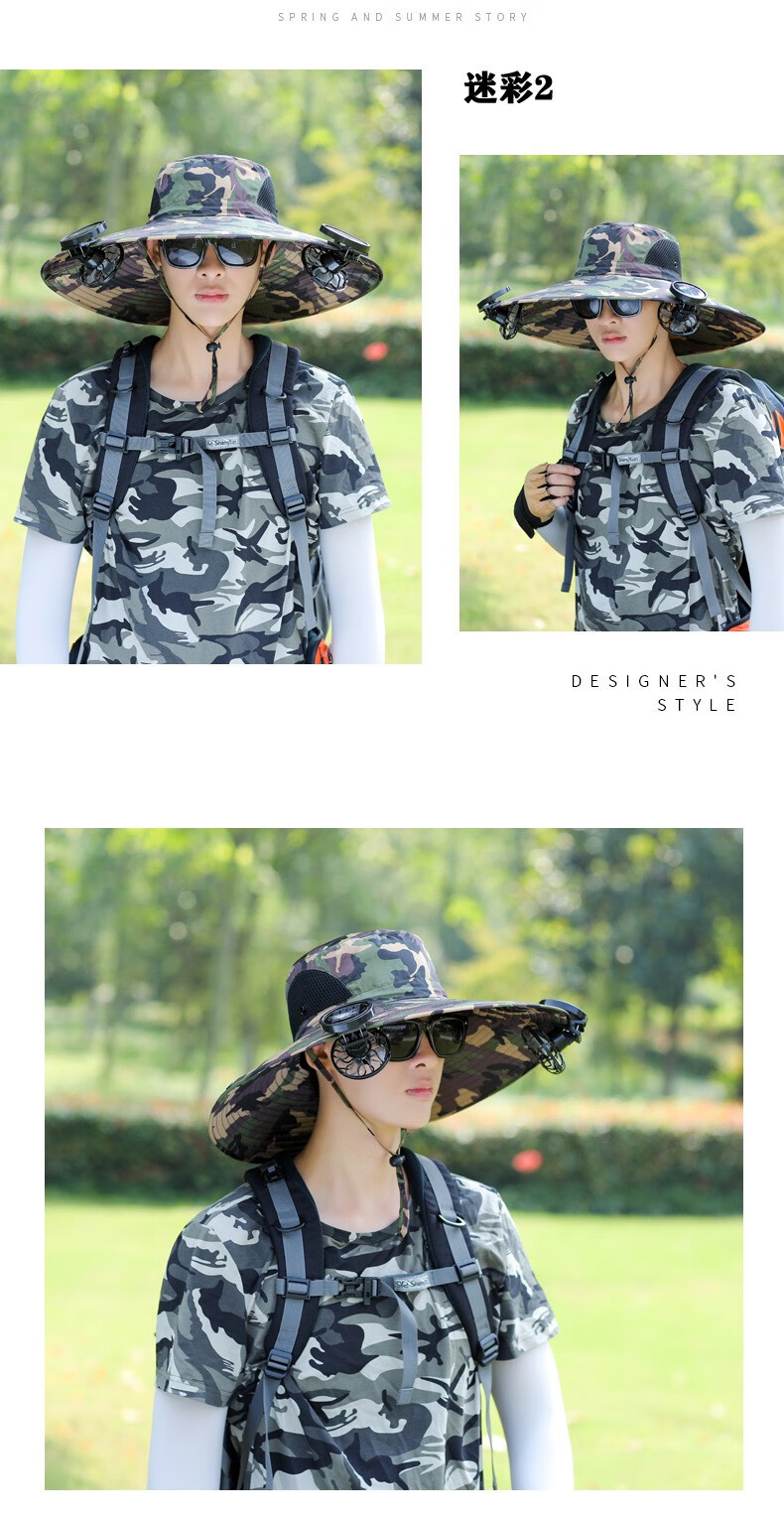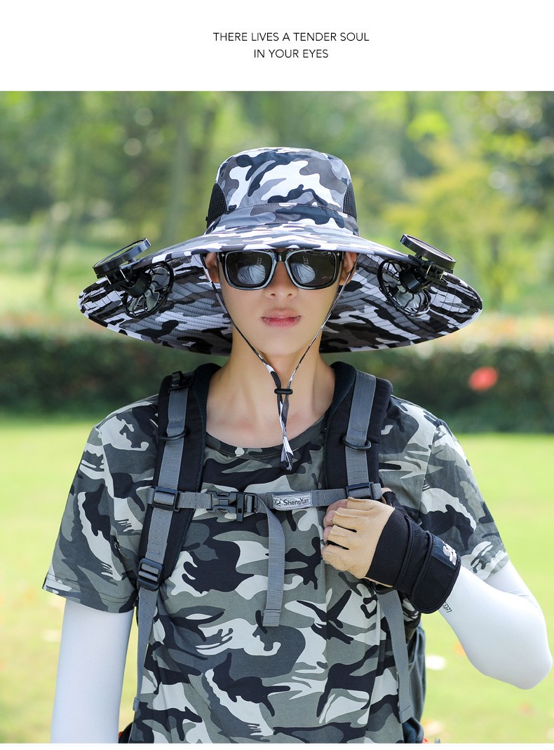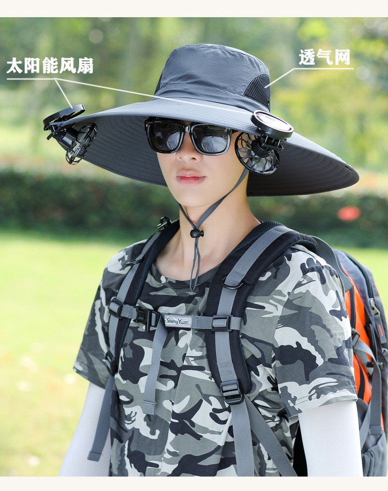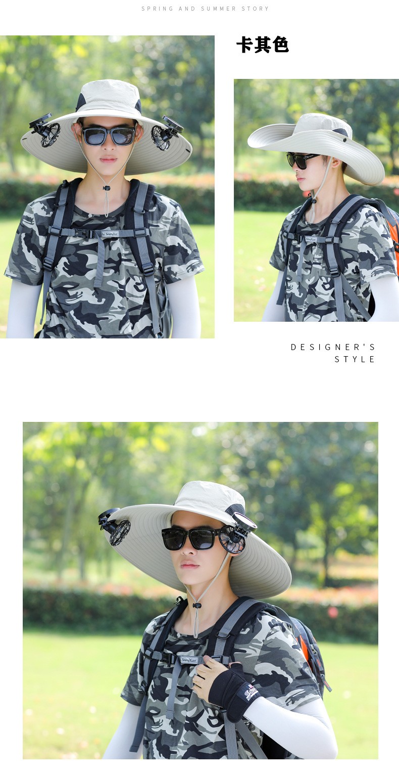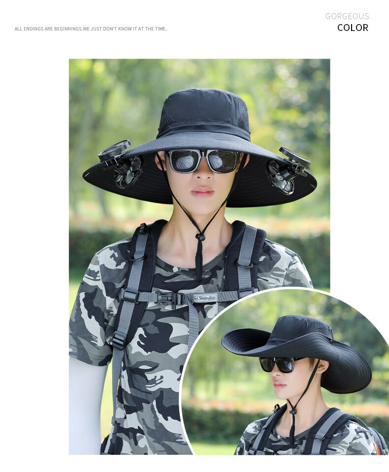 太陽能風扇帽 黑色 【鋼絲款+2個太陽能風扇】大檐透氣漁夫帽