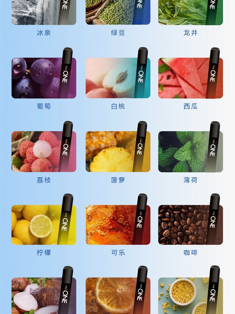 口味 | 葡萄 西瓜 薄荷 冰泉 柠檬 菠萝 白桃 龙井 白茶 绿豆 可乐 荔枝 蜜瓜 梅果 茉莉 | |