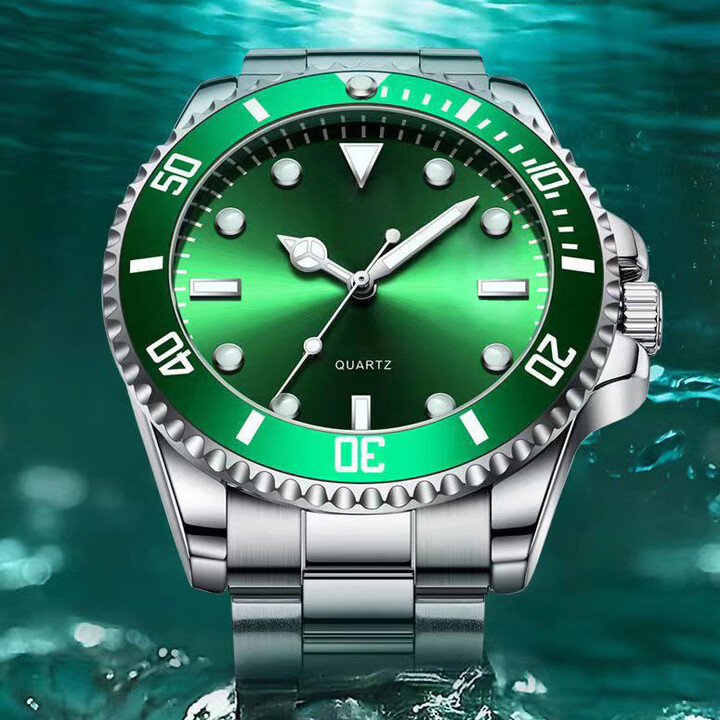 高級感時尚男士小黑綠水鬼手錶男夜光石英表鋼帶腕錶