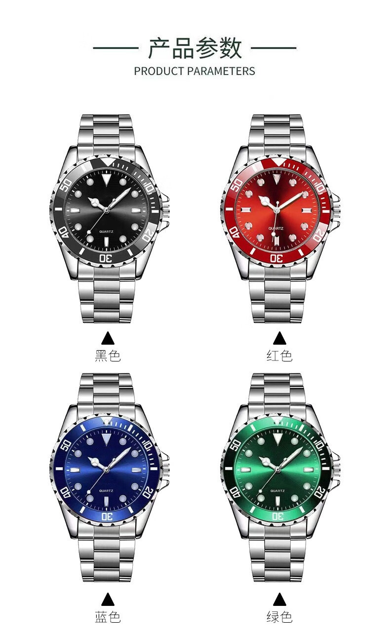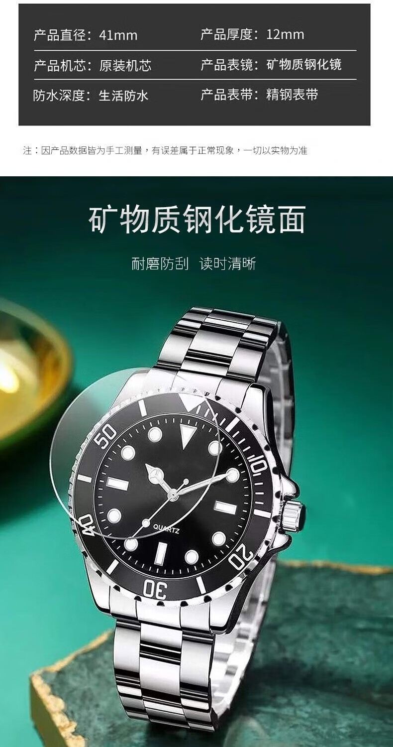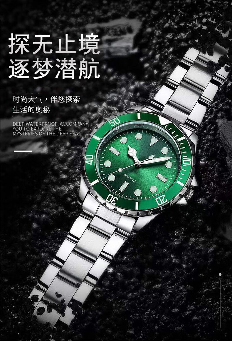 高級感時尚男士小黑綠水鬼手錶男夜光石英表鋼帶腕錶